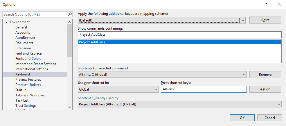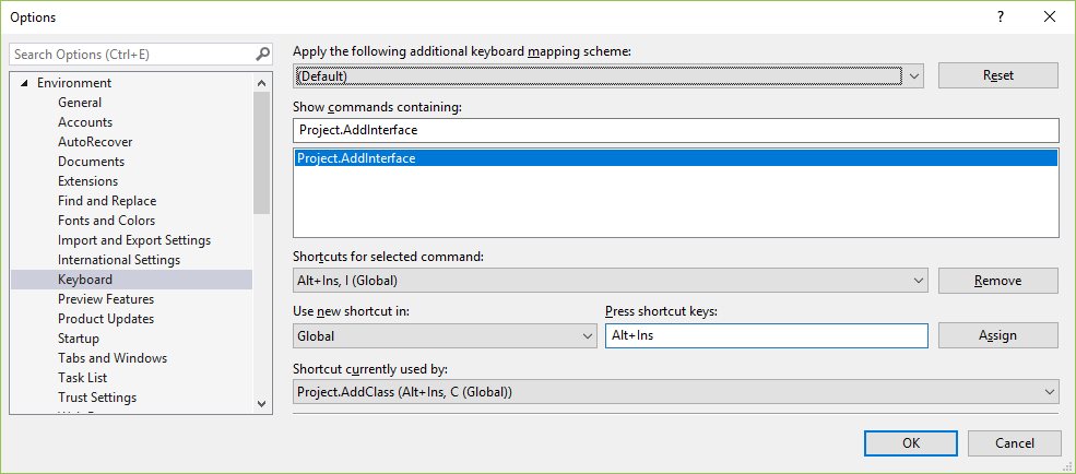 As with AddClass, the default way to add an interface from SolutionExplorer involves additional clicks. To add a new interface directly from the SolutionExplorer, by adding a keybinding for Project.AddInterface